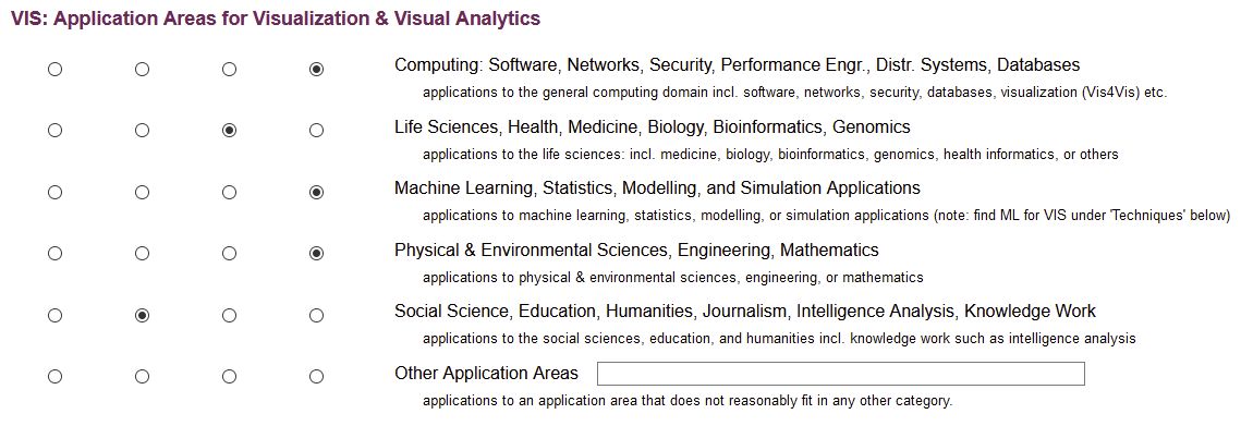 Note that setting your expertise to “expert” does not mean that you will by default or automatically be assigned papers related to the keyword. This is particularly important to remember for the large domain keywords shown above. Of course nobody can be an expert in all visualization applications to “Social Science, Education, Humanities, Journalism, …” for example. However, if you are interested in seeing recommendations in the bidding interface for education papers and you consider yourself an expert in visualization for education, then select “expert” for this keyword as those papers will show high in your list. You do not need to bid on the journalism, intelligence analysis, etc. papers that will also show up there - remember that the numbers of papers that have chosen this particular keyword is likely manageable.